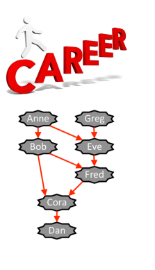 Consider the example depicted in the figure. There are seven employees and eight precedence rules. An arrow from an employee x to an employee y means that x outperformed y. The number of promotions is limited to the interval [3, 4]. Therefore: